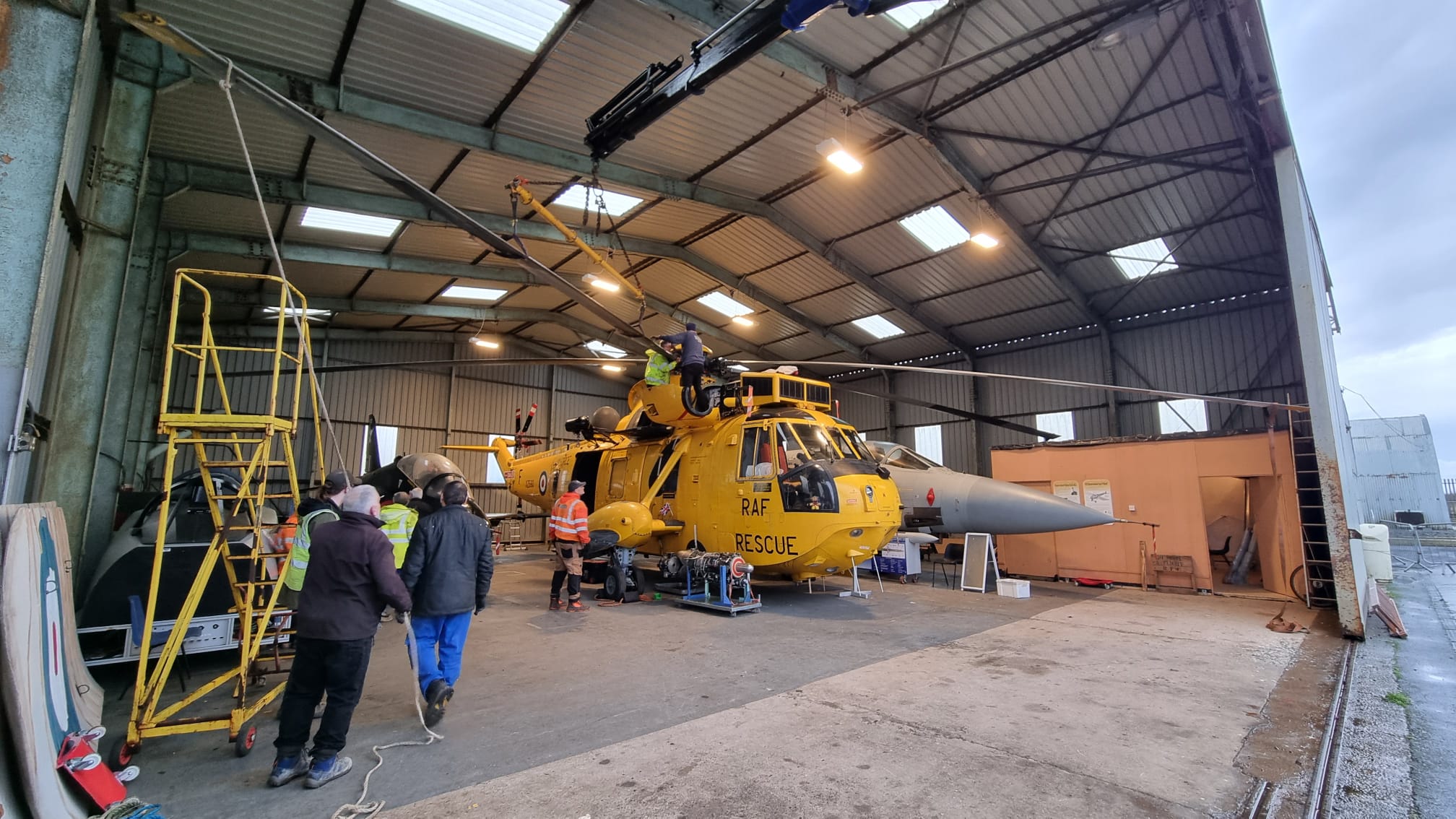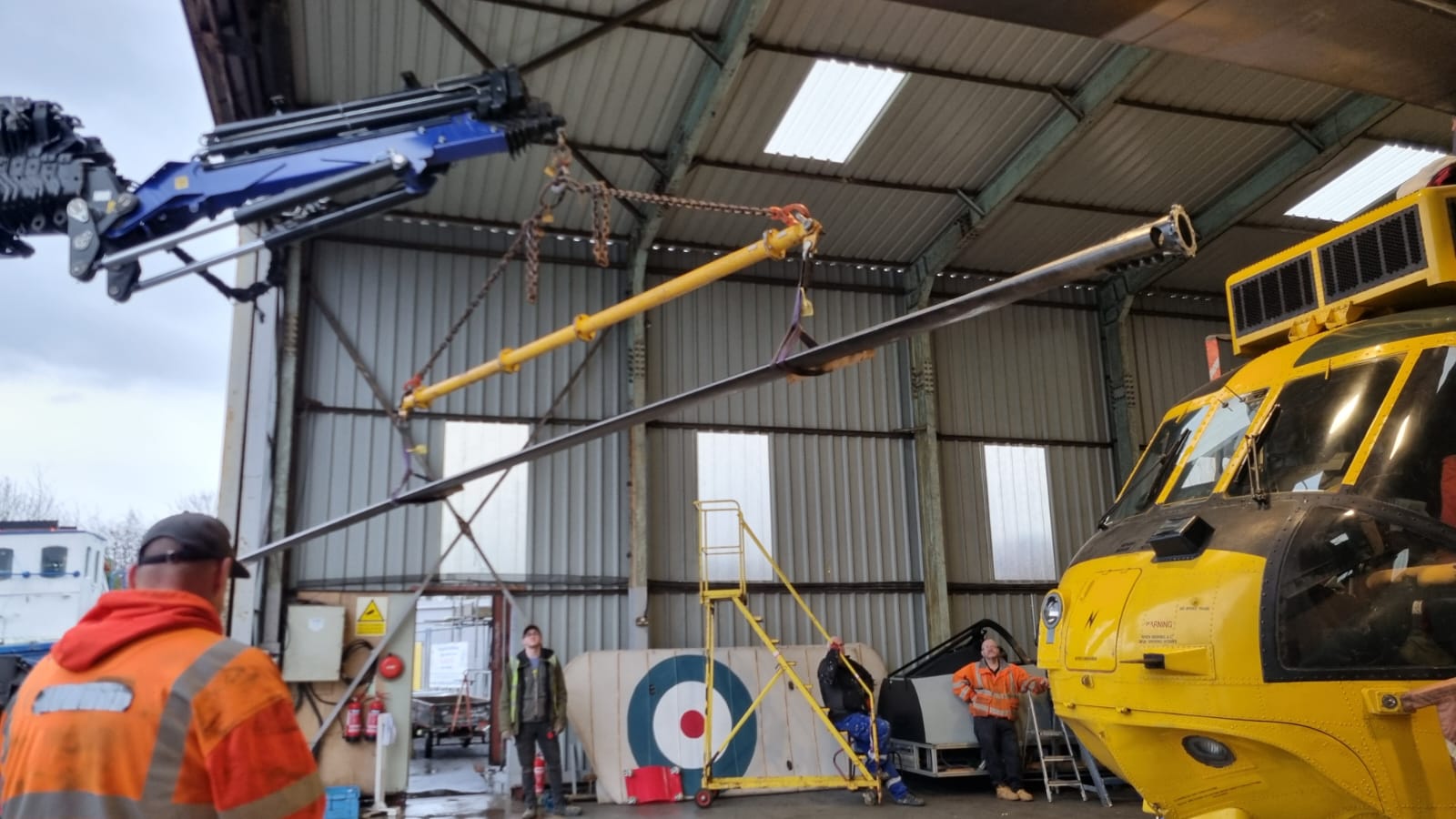 Each helicopter blade, long, weighty and requiring careful handling, was slung and lifted with slow, considered movements. The hangar became a hive of activity: volunteers guiding the lift, engineers positioning ladders and equipment, and spotters ensuring every movement happened safely. Inside, the bright yellow Sea King waited, its rotor head ready to receive the blades.