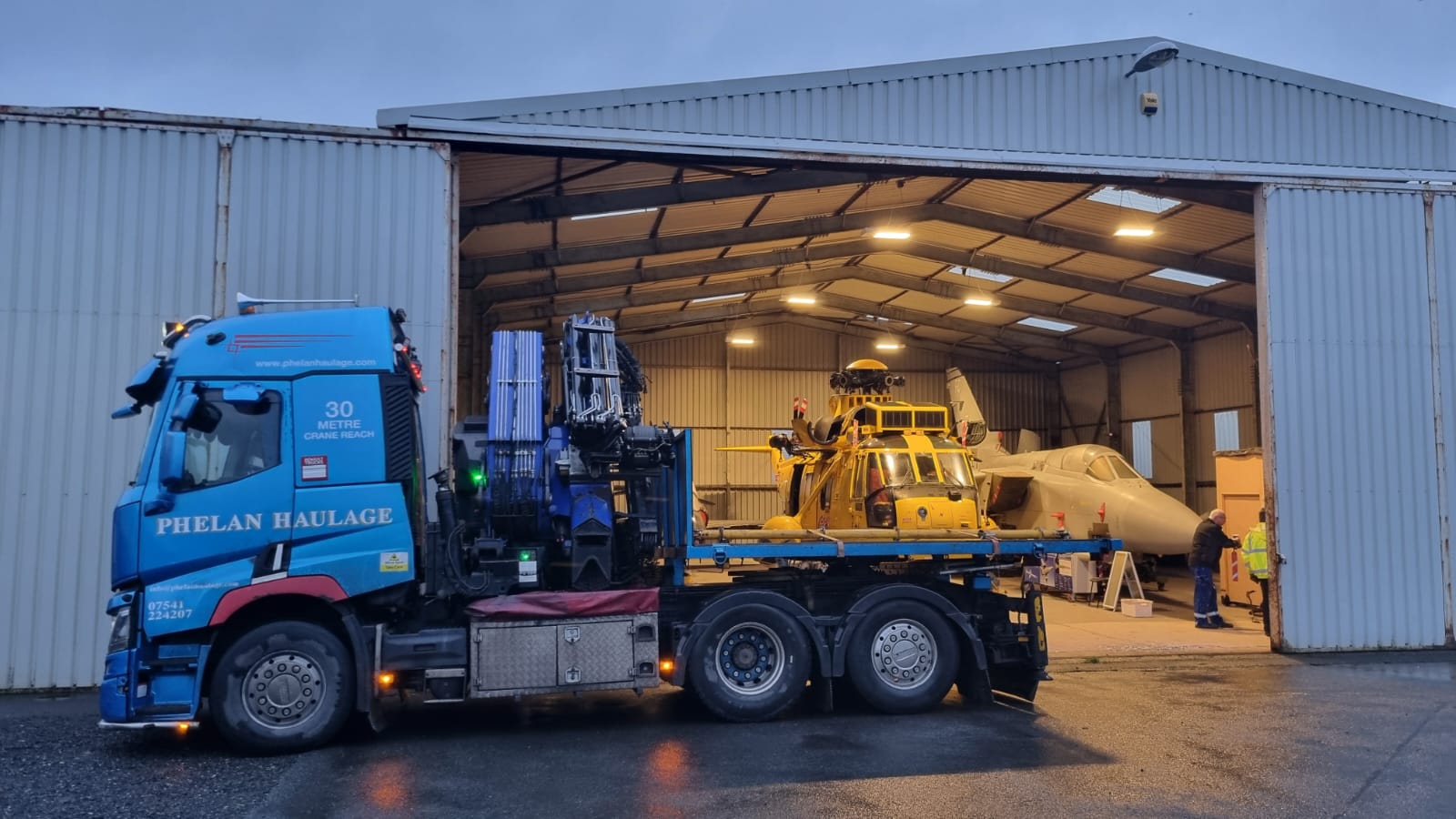 The job called for one of Phelan Haulage’s specialist crane-equipped lorry, boasting a 30-metre reach. The team positioned the vehicle at the mouth of the hangar, deploying stabilisers before extending the crane arm high above the museum aircraft.