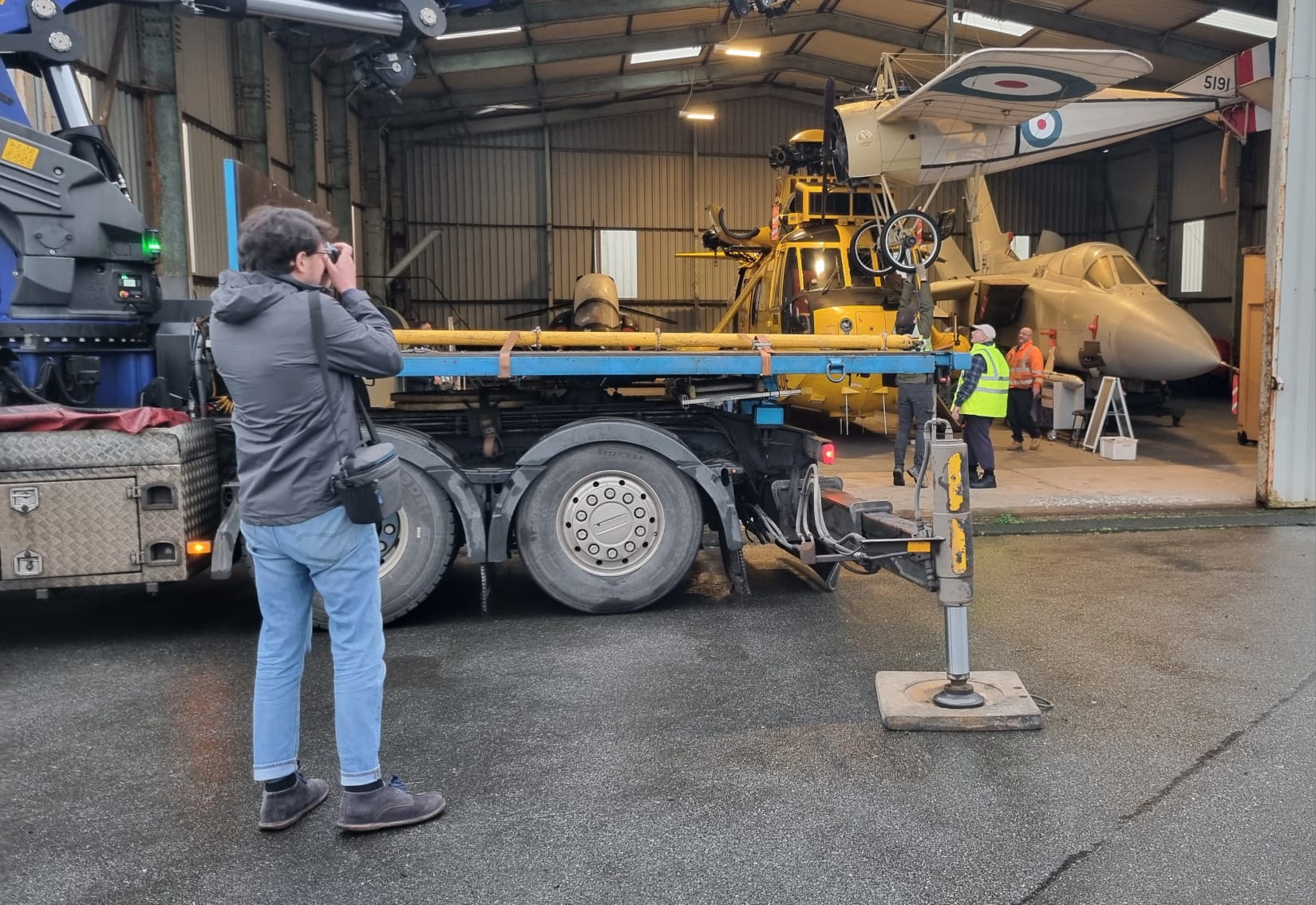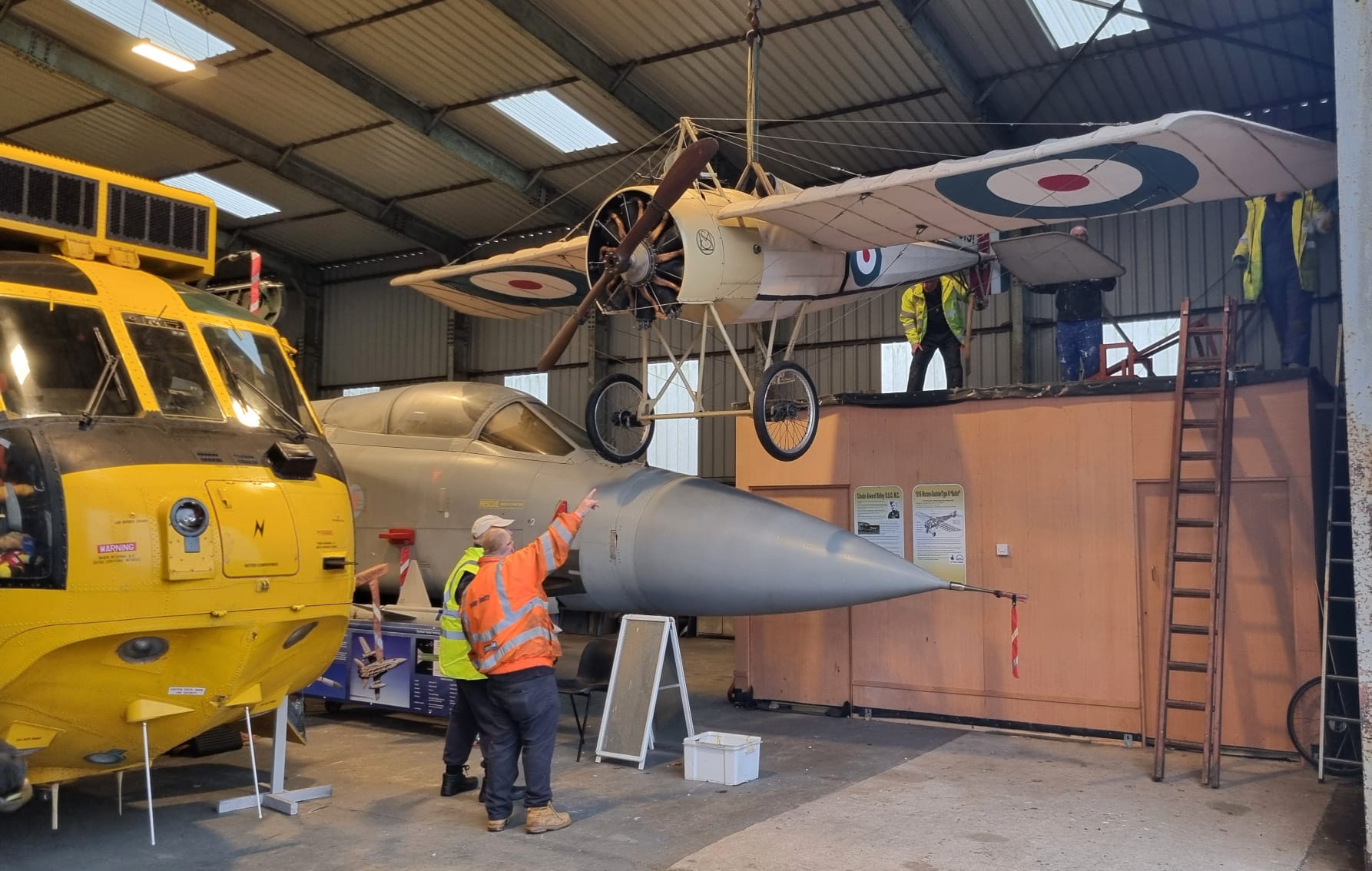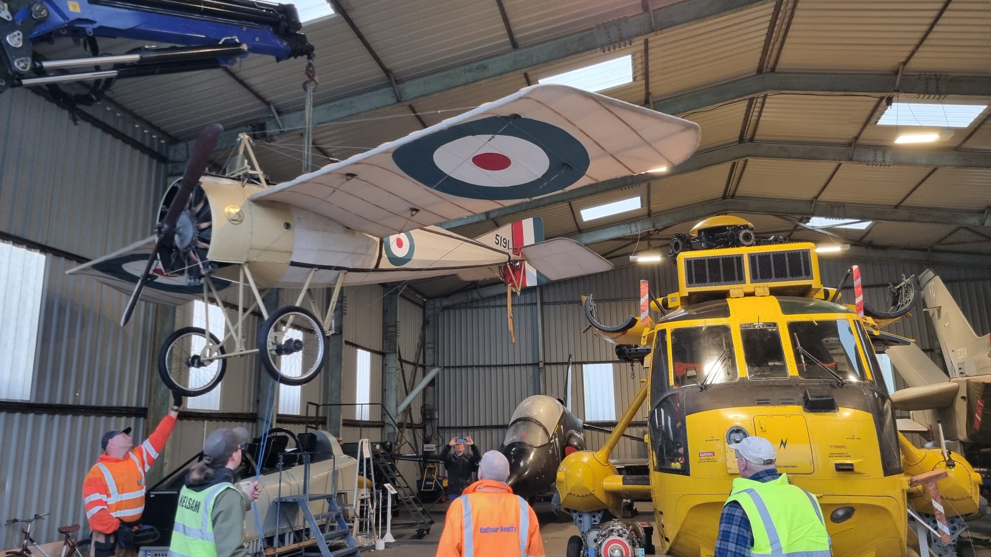 The lift also offered a striking setting. Alongside the Sea King stood NELSAM’s collection of classic aircraft, from fast jets to early aviation replicas. At one stage, the crane worked above a First World War-era monoplane suspended mid-air, an image that perfectly captures the museum’s blend of historic eras.